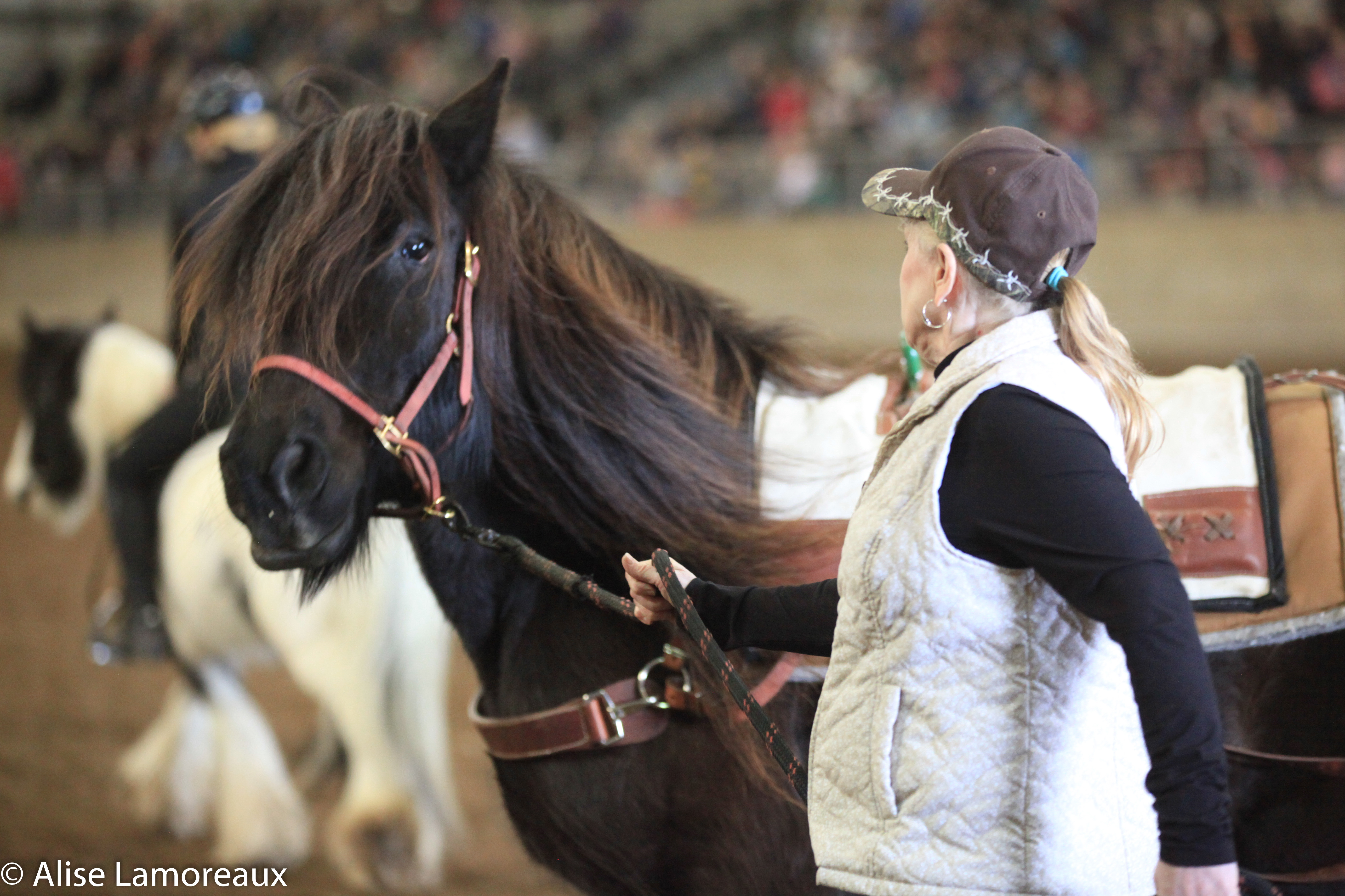 Copper joined Braeberry Barnabas, Greenholme Viv, and Dreamhayven Decadence of Moonlit Fells to represent the Fell breed at the 2014 NW Horse Expo in Albany, Oregon. In addition to daily demos for the breed, Copper was invited to participate in a Mt. Trail demo put on by Mitch and JoLinn Hoover. Copper and Viv are owned by Cheryl Dutton of Braeberry Farm Fells.